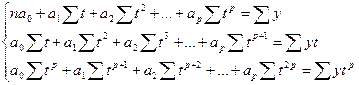 Согласно этому методу, для нахождения параметров полинома р-й степени необходимо решить систему так называемых нормальных уравнений: