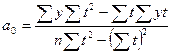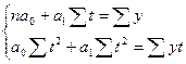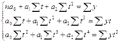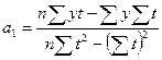 Начнем определение тенденции с самого простого полинома - уравнение прямой (10.19). Решая систему нормальных уравнений, получим искомые параметры: