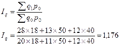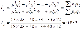 Третьим индексом в данной индексной системе является сводный индекс физического объема реализации. Он характеризует изменение количества проданных товаров не в денежных, а в физических единицах измерения. Весами в данном случае выступают цены, которые фиксируются на базисном уровне: