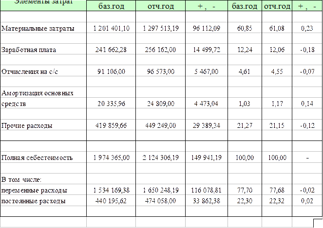 Как видно из таблицы 18.1 фактические затраты предприятия выше затрат предыдущего периода на 149 941,19 тыс. руб. или на 7,6%. Перерасход произошел по всем видам и особенно по материальным затратам. Увеличилась сумма, как переменных, так и постоянных расходов. Изменилась несколько и структура затрат: увеличилась доля материальных затрат и амортизации основных средств, а доля затрат на оплату труда уменьшилась. В целом присутствует материал - емкий тип производства.