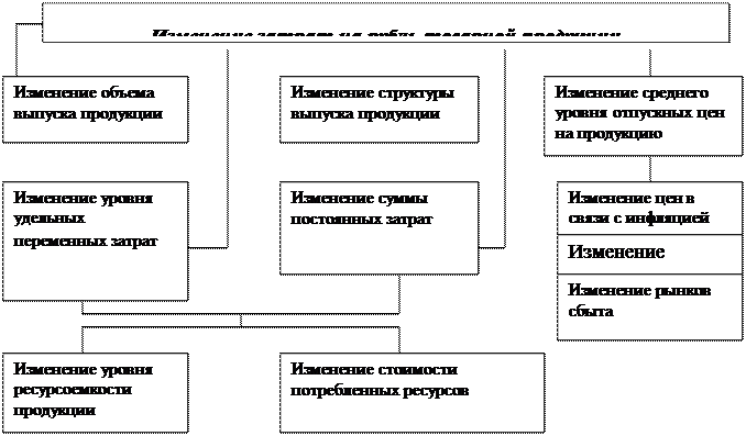 Затраты на рубль товарной продукции непосредственно зависят от изменения общей суммы затрат на и реализацию продукции и от изменения стоимости произведенной продукции. На общую сумму затрат оказывают влияние объем производства продукции, ее структура, изменение переменных и постоянных затрат, которые в свою очередь могут увеличиться или уменьшиться за счет уровня ресурсоемкости продукции и цен на потребленные ресурсы. Стоимость товарной продукции зависит от объема выпуска, её структуры и цен на продукцию. Взаимосвязь перечисленных факторов показана на рис.18.3