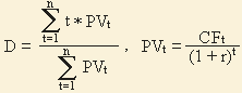 Если имеется несколько альтернативных проектов с одинаковыми (близкими) значениями NPV, IRR, то при выборе окончательного варианта инвестирования учитывается длительность инвестиций. Дюрация (D) - это средневзвешенный срок жизненного цикла инвестиционного проекта, где в качестве весов выступают текущие стоимости денежных потоков, получаемых в период t, или другими словами, как точку равновесия сроков дисконтированных платежей. Она позволяет привести к единому стандарту самые разнообразные по своим характеристикам проекты (по срокам, количеству платежей в периоде, методам расчета причитающегося процента).