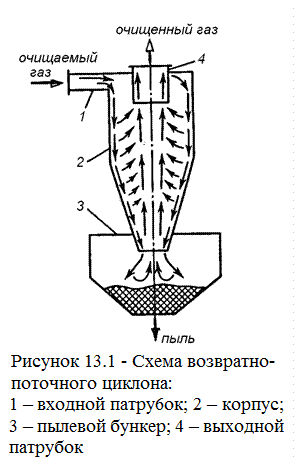 Из пылеуловителей наиболее широкое распространение получили циклоны, что объясняется прежде всего простотой их конструкции и, более высокой, чем у других инерционных пылеуловителей эффективностью пылеулавливания. Схема возвратно-поточного циклона представлена на рис.13.1. Принцип действия его заключается в следующем. Поток газовзвеси поступает в циклон закрученным, вследствие чего на частицы пыли действует центробежная сила, отбрасывающая их к стенке, вдоль которой они движутся по спирали вниз в пылевой бункер.