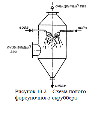 Полые оросительные газопромыватели (скрубберы) представляют собой пустотелый корпус, в который подают запыленный газ, в верхней части расположены оросительные форсунки для подачи воды (рис.13.2.). Газ движется противотоком падающим каплям воды. Однако бывают конструкции с прямоточным и поперечным потоком газа.