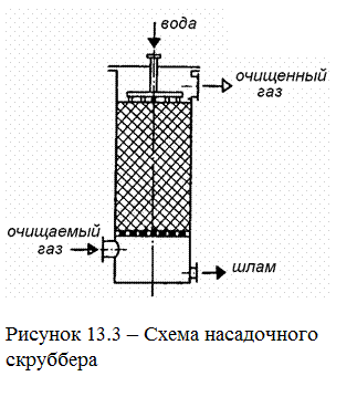 Насадочные газопромыватели представляют собой колонные аппараты с неподвижной насадкой в виде колец, шаров и другой формы. Насадка предназначена для увеличения поверхности контакта фаз. Жидкость течет пленкой по насадке, газ проходит противотоком (рис.13.3). Удельный расход жидкости составляет 1,3-2,6 л/м3. Эффективность пылеулавливания частиц размером свыше 2 мкм более 90%.