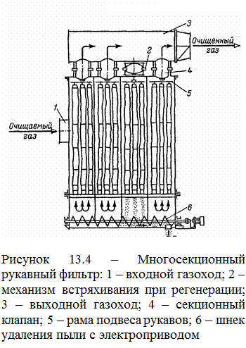 Многосекционный фильтр с регенерацией встряхиванием и обратной продувкой показан на рисунке 13.4.