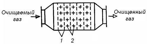 Рисунок 13.5 – Схема однозонного электрофильтра с поперечным движением газа: 1 – осадительные электроды; 2 – коронирующие электроды