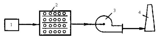 Простые схемы включают один пылеуловитель. Так, при мокром способе производства цемента применяют схему, представленную на рисунке 13.6. Источником пыли является печь обжига клинкера 1. Запыленный воздух проходит очистку в электрофильтре 2 и с помощью дымососа 3 удаляется через дымовую трубу 4 в атмосферу.