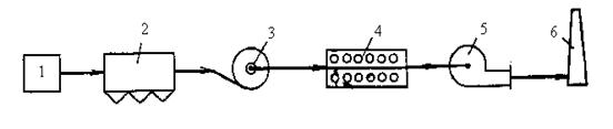 Источниками пыли являются обжиговые печи, узлы пересыпки, транспортировки и т. д. Газы, отводимые от источников пылеобразования, после коллектора 2 поступают на очистку в одиночные или батарейные циклоны 3, затем в электрофильтр 4 и через вентилятор 5 – в дымовую трубу 6.