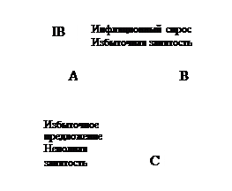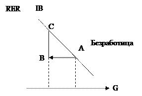 На рисунке 1 построен график внутреннего равновесия (IВ) для данного уровня дохода. Предположим, что экономика находится в точке А, которая соответствует "полной занятости". Увеличение G приведет к росту Y и избыточной занятости. Экономика из точки А перемещается вправо в точку B. Для того чтобы внутреннее равновесие было восстановлено, необходимо девальвировать валюту. В результате ревальвации произойдет реальное удорожание валюты (снижение RER) и экономика из точки B переместится в равновесную точку C. Соединив точки А и В мы получим кривую внутреннего равновесия IВ, которая имеет отрицательный наклон. Все точки на этой кривой соответствуют уровню совокупного выпуска при "полной занятости".