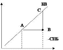 На рисунке 2 представлен график внешнего равновесия. Пусть экономика первоначально находится в точке А, которая соответствует внешнему равновесию. Увеличение G приведет к росту Y и избыточной занятости. Экономика переместится из точки А в точку B. Следствием роста Y будет сокращение NX, то есть отрицательное сальдо баланса текущих операций. Для восстановления внешнего равновесия необходимо девальвировать валюту, что приведет к реальному обесценению (рост RER) и достижению нулевого сальдо текущего счета. Экономика из точки B переместится в равновесную точку C. Соединив точки А и C, мы получим кривую внешнего равновесия ЕВ, вторая имеет положительный наклон.