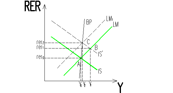 Рассмотрим последствия для внутреннего и внешнего равновесия стимулирующей бюджетно-налоговой политики (например, увеличения государственных расходов) в экономике с низкой мобильностью капитала. Увеличение государственных расходов вызывает рост совокупного спроса – кривая IS сдвигается вправо до положения IS1 . В результате доход растет до уровня Y1 и с ним увеличивается ставка процента до RER1, потому что увеличение дохода повышает спрос на деньги. Точка внутреннего равновесия перемещается из точки А в точку В.