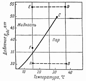 Из рисунка 4.2 следует, что путём соответствующих изменений давления и температуры углеводороды можно перевести из парообразного состояния в жидкое, минуя двухфазную область. Газ, характеризующийся параметрами точки А (рис. 4.2), можно изобарически нагреть до температуры точки В, а затем, повысив давление в системе при постоянной температуре, перевести вещество в область точки D, расположенную выше критической точки С, и далее в область точки Е. Свойства системы при этом изменяются непрерывно, и разделения углеводорода на фазы не произойдёт. При дальнейшем охлаждении системы (от точки D до точки Е), а затем при снижении давления до точки F вещество приобретёт свойства жидкости, минуя область двухфазного состояния.