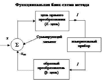 Отличительной особенностью этого метода является наличие цепи отрицательной обратной связи (β - цепь), охватывающей цепь прямого преобразования (К - цепь). Благодаря этому на вход измерительного прибора поступает не весь измеряемый сигнал, а лишь его часть, пропорциональная исходному сигналу.
