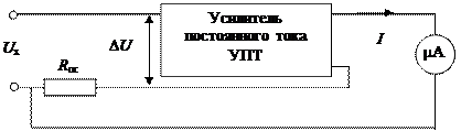 Здесь I=K Δ U, Δ U = U x– IR oc. В этой схеме обычно Δ U << U x. Ток, измеряемый амперметром, пропорционален искомому напряжению: