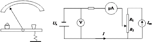 Пример 1. Взвешивание груза. Вес груза частично компенсируется весом гири. В результате стрелка отклоняется на малый угол.
