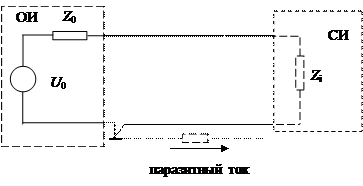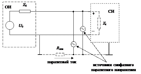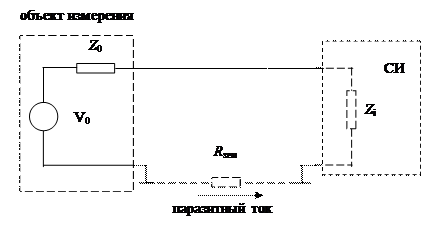 В земляной шине имеются паразитные блуждающие токи, вызываемые другим оборудованием. Это токи создают на сопротивлении шины R зем дополнительное напряжение, которое оказывается включенным последовательно с измеряемым напряжением объекта и, таким образом, создаются аддитивные погрешности.