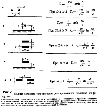 На рис.2 приведены формулы для определения волнового сопротивления проводников с различной формой сечения при разном взаимном расположении. Эти формулы можно использовать даже тогда, когда указанные неравенства не выполняются. В этом случае получаются завышенные значения Z 0, поскольку в уравнениях не учитываются краевые эффекты.