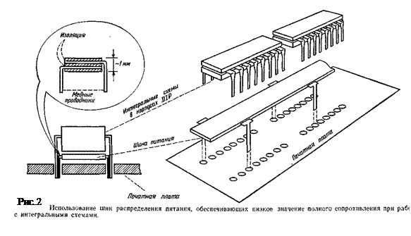 , т. е. указанная конфигурация проводников обеспечивает линию разводки питания с очень малым волновым сопротивлением. Выпускаемые шины такого типа пригодны для использования с интегральными схемами, размещаемыми на печатных платах (рис.2).