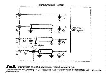 В тех местах, где проводник проходит сквозь экран, следует использовать проходные конденсаторы, а между проводником и землей на конце цепи необходимо включать слюдяной или керамический конденсатор с короткими выводами. Такое соединение, а также три других способа фильтрации шины питания для высокочастотных схем показаны на рис.5.