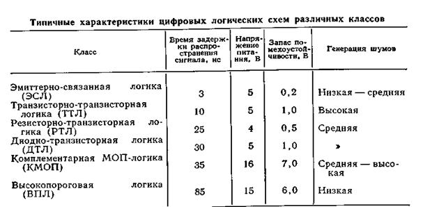 В таблице приведены типичные характеристики различных семейств цифровых интегральных логических схем. В колонке «генерация шумов» схемы оцениваются с точки зрения излучаемых и наводимых шумов. Больше всего шумов генерируют логические схемы ТТЛ, меньше всего – логические схемы с высоким порогом (ВПЛ). Скорость переключения вентиля пропорциональна задержке распространения сигнала, указанной в таблице. Наибольшим быстродействием обладают ЭСЛ-схемы, наименьшим – ВПЛ.