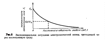 При прохождении электромагнитной волны в среде ее амплитуда уменьшается экспоненциально, как показано на рис.6. Это объясняется тем, что токи, индуцируемые в среде, вызывают омические потери и, следовательно, нагрев вещества.