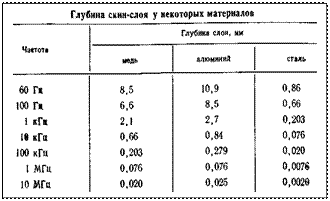 Некоторые характерные значения глубины скин-слоя для меди, алюминия и стали приведены в таблице.