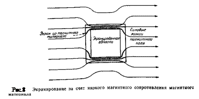 Дополнительную защиту от низкочастотных магнитных полей можно обеспечить только созданием магнитного шунта с низким значением магнитного сопротивления для отвода поля от защищаемой схемы. Этот метод иллюстрируется рис.8.