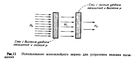 Чтобы исключить насыщение, можно использовать многослойные магнитные экраны. Пример такого экрана представлен на рис.11. Здесь первый экран (из материала с низкой магнитной проницаемостью) имеет высокий уровень насыщения, а второй экран (из материала с высокой магнитной проницаемостью) – низкий. Первый экран уменьшает напряженность магнитного поля до величины, которая не вызывает насыщения второго экрана, обеспечивающего основное экранирование магнитного поля. Такие экраны можно также делать, используя в качестве первого экрана проводящий материал, например медь, а для второго – магнитный материал. Материал с низкой магнитной проницаемостью и высоким уровнем насыщения всегда помещается на стороне экрана, ближней к источнику магнитного поля. В некоторых сложных случаях для получения желаемого ослабления поля могут потребоваться дополнительные слои экрана.