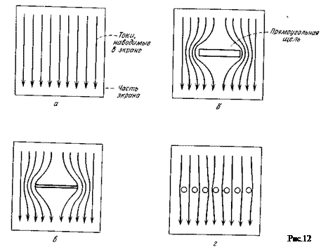 На рис.12, а изображено сечение оплошного экрана с наведенными в нем токами На рис.12, б показано, как прямоугольная щель заставляет наведенные в экране токи идти в обход щели, что уменьшает эффект экранирования и приводит к возникновению утечки. На рис.12, в изображена намного более узкая щель той же длины. Эта более узкая щель оказывает на ток то же влияние, что и широкая щель на рис.12, б и вызывает, следовательно, утечку такой же величины. На рис.12, г показано, что группа небольших отверстий оказывает на ток намного меньшее возмущающее действие, чем щель на рис.12, б и поэтому они вызывают появление меньшей утечки даже в том случае, когда их общая площадь та же, что и у щели. Из рассмотрения фигур становится ясно, что большое число маленьких отверстий создает меньшую утечку, чем большое отверстие с той же площадью.