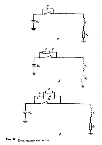 На рис.16 показаны три вида цепей защиты, которые обычно ставятся на контакты, управляющие индуктивной нагрузкой. Один из простейших методов гашения дуги, возникающей при разрыве цепи с током, заключается во включении параллельно с контактами конденсатора (рис.16, а). При достаточно большой емкости конденсатора ток нагрузки в момент размыкания контактов проходит через конденсатор, и дуговой разряд не возникает. Однако когда контакты разомкнуты, конденсатор заряжается до напряжения питания U =. Затем, когда контакты замыкаются, конденсатор разряжается через них с начальным разрядным током, ограниченным лишь паразитным сопротивлением проводников и контактов.