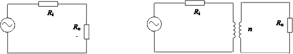 Пусть R i>> R н. Это соотношение далеко от оптимального. В этом случае оптимальное согласование можно обеспечить, используя согласующий трансформатор. Здесь n – коэффициент трансформации (отношение количества витков в первой обмотке к числу витков во второй). Эту схему можно представить в виде контура с эквивалентным сопротивлением нагрузки, определяемым по формуле R н экв = n 2 R н.