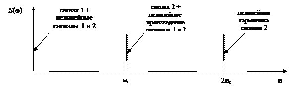 Если шум на входе нелинейного СИ отсутствует, то спектр сигнала на выходе будет иметь вид, показанный на рис. ниже. Из него видно, что, даже при отсутствии шума, через нелинейное СИ без искажения не проходит ни постоянный сигнал, ни переменный сигнал. Отделить нелинейные искажения сигналов с помощью частотного фильтра нельзя, поскольку эти искажения имеют те же частоты, что и полезные сигналы.