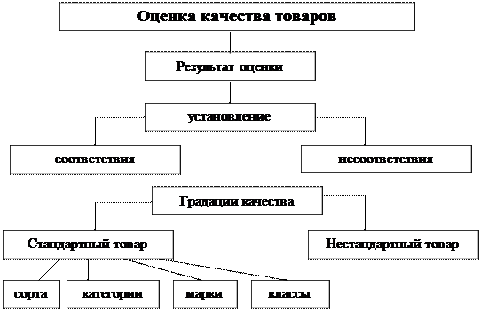 Товар, удовлетворяющий требованиям к любой из градаций качества, является стандартным. Важнейшими градациями качества стандартных товаров являются сорта, марки, классы, группы сложности, номера, категории и другие. К нестандартному относится товар, который не соответствует установленным требованиям по одному или комплексу показателей. Невыполнение заданного или ожидаемого требования, касающегося объекта, называется дефектом. Ниже приведены возможные результаты сопоставления действительных и базовых показателей качества - градации качества (рис. 2).