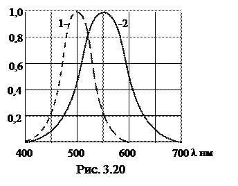 стандартизирована для зрения, адаптированного к темноте и к свету. Обе функции нормированы на 1. Для дневного зрения максимум приходится на длину волны примерно λ = 555 нм. Для глаза, привыкшего к темноте, спектральная кривая смещена в сторону коротких длин волн (рис. 3.20).