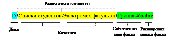 Это означает, что для доступа к файлу Группа 46а.doc нужно выбрать диск D, а затем последовательно открыть папки, перечисленные в пути доступа.