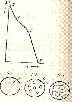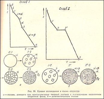 Кривая охлаждения сплава при образовании твердого раствора и схема структур