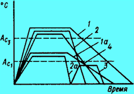 Графики различных видов термообработки: отжига (1, 1а), закалки (2, 2а), отпуска (3), нормализации (4)