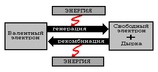 При отсутствии электрического поля дырка, как и электрон, будет совершать хаотические колебания, при этом происходят и обратные переходы электронов из зоны проводимости на свободные уровни валентной зоны (рекомбинация). Эти процессы условно показаны на рисунке