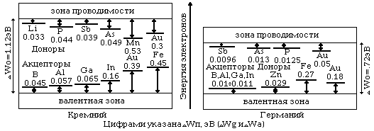 В примесном полупроводнике взаимосвязь между количеством электронов и дырок подчиняется закону действующих масс n. p=ni2, где ni собственная концентрация. Таким образом, чем больше вводится электронов, тем меньше концентрация дырок. На рисунке на энергетической диаграмме (по Ш.Я.Коровскому) показаны донорные и акцепторные уровни различных примесей в германии и кремнии.