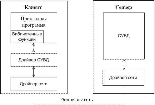 Каждая СУБД помимо интерактивной SQL-утилиты обязательно имеет библиотеку доступа и набор драйверов для различных операционных систем. Схема взаимодействия клиентского приложения с сервером базы данных в этом случае приведена на рис.2