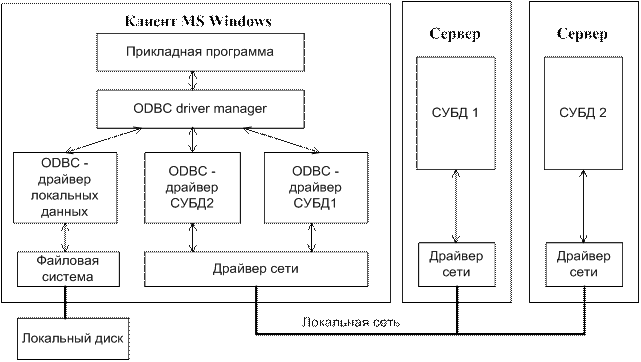 Очень важный шаг к созданию переносимых приложений обработки данных сделала фирма Microsoft, опубликовавшая в 1992 году спецификацию ODBC (Open Database Connetcivity – открытого интерфейса к базам данных), предназначенную для унификации доступа к данным с персональных компьютеров работающих под управлением операционной системы Windows. (Заметим, что ODBC опирается на спецификации CLI). Структурная схема доступа к данным с использованием ODBC приведена на рис.3:
