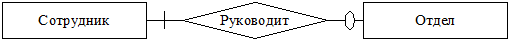 · один к одному (обозначается 1: 1). Это означает, что в такой связи сущности с одной ролью всегда соответствует не более одной сущности с другой ролью. В рассматриваемом примере это связь «руководит», поскольку в каждом отделе может быть только один начальник, а сотрудник может руководить только в одном отделе. Так как степень связи для каждой сущности равна 1, то они соединяются одной линией.