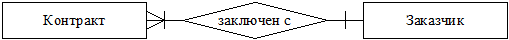 · Много к одному (n: 1). Предположим, что предприятие строит свою деятельность на основании контрактов, заключаемых с заказчиками. Этот факт отображается в модели «сущность-связь» с помощью связи Контракт-Заказчик, объединяющей сущности Контракт (номер, срок исполнения, сумма) и Заказчик (наименование, адрес). Так как с одним заказчиком может быть заключено более одного контракта, то связь Контракт-заказчик между этими сущностями имеет степень n: 1 (рис. 6).