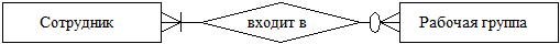 · многие ко многим (n: n). В этом случае каждая из ассоциированных сущностей может быть представлена любым количеством экземпляров. Пусть на рассматриваемом предприятии для выполнения каждого контракта создается рабочая группа, в которую входят сотрудники разных отделов. Поскольку каждый сотрудник может входить в несколько (или ни в одну) рабочих групп, а каждая группа должна включать не менее одного сотрудника, то связь между сущностями СОТРУДНИК и РАБОЧАЯ ГРУППА имеет степень n: n (рис. 7).