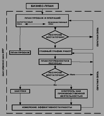 Система MRP II схематически изображена на рисунке (Рис. 4.). Здесь следует обратить внимание на существующие циклы обратной связи.