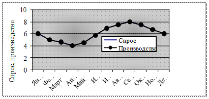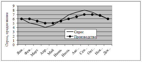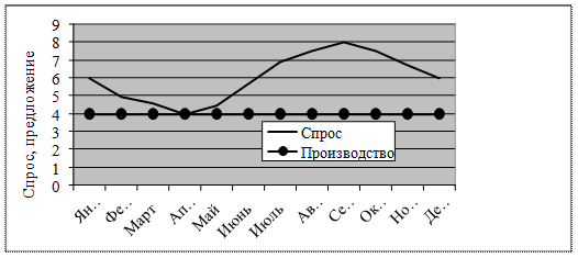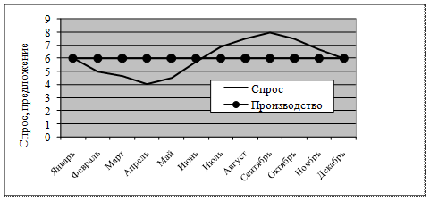 Равномерное производство. При равномерном производстве постоянно производится объем продукции, равный среднему спросу. Это соотношение отображено на рисунке (Рис. 4..) Организации рассчитывают общий спрос на планируемый период времени и в среднем производят достаточный объем товаров для удовлетворения этого спроса. Иногда спрос оказывается меньше произведенного объема, в этом случае накапливаются запасы готовых товаров. В другие периоды спрос превышает объем производства, тогда эти запасы товаров используются.