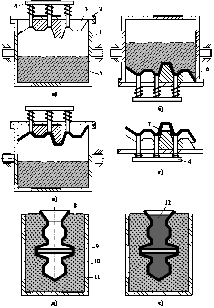 Рис. 3.17. Изготовление и заливка оболочковой формы: а – модельное приспособление в исходном положении; б – поворот бункера и формирование полутвёрдой оболочки на модельной плите; в – возврат бункера в исходное положение; г – съём затвердевшей оболочки с модельной плиты; д – установка собранной оболочковой формы в контейнерную опоку и засыпка подпорного материала; е – заливка оболочковой формы расплавом: 1 – поворотный бункер; 2 – металлическая модельная плита; 3 – металлическая модель; 4 – блок выталкивателей; 5 – формовочная смесь; 6 – полутвёрдая оболочка; 7 – затвердевшая оболочка; 8 – склеенная оболочковая форма; 9 – оболочковый стержень; 10 – контейнерная опока; 11 – подпорный материал; 12 – расплав |