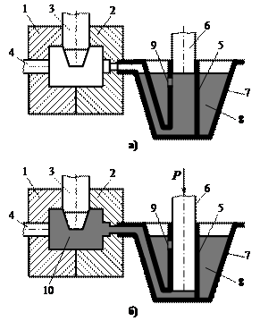 Рис. 3.23. Изготовление отливки литьём под давлением на машине с горячей камерой прессования: а – заливка порции расплавленного металла в камеру прессования; б – подача расплава плунжером в полость пресс-формы и формирование отливки: 1 – подвижная полуформа; 2 – неподвижная полуформа; 3 – стержень; 4 – выталкиватель; 5 – камера прессования; 6 – плунжер; 7 – обогреваемый тигель; 8 – расплавленный металл; 9 – впускное отверстие; 10 – отливка |