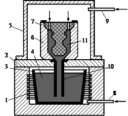 Рис. 3.25. Изготовление отливки литьём с противодавлением: 1 – печь электросопротивления; 2 – герметизирующая крышка; 3 – тигель; 4 – расплавленный металл; 5 – герметичный кожух; 6 – литейная форма; 7 – песчаный стержень; 8 – нижняя нагнетающая труба; 9 – верхняя нагнетающая труба; 10 – металлопровод; 11 – отливка | них одинаковое давление 2 МПа, оказывающее на расплав уравновешивающее встречное воздействие. Затем в верхней камере немного сбрасывают давление до получения перепада в 0,1 МПа, под действием которого расплавленный металл 4 поступает в металлопровόд 10 и плавно заполняет полость формы 6. При этом металл находится под двусторонним избыточным давлением 1,9 МПа (этого давления нет при литье под низким давлением), которое способствует более надёжному заполнению достаточно узких каналов литейной формы. После затвердевания отливки под этим принудительным давлением оно сбрасывается из верхней и нижней камер, незатвердевший металл сливается из металлопровода 10 в тигель 3, после чего осуществляется извлечение отливки 10. Литьё с противодавлением обеспечивает надёжное плавное заполнение полости формы и направленное затвердевание отливки, что приводит к получению отливок с повышенной прочностью и герметичностью. Кроме того, сокращается расход металла на литниковую систему. При литье с противодавлением для изготовления отливок используются как металлические, так и разовые формы: песчаные, оболочковые, по выплавляемым моделям. |